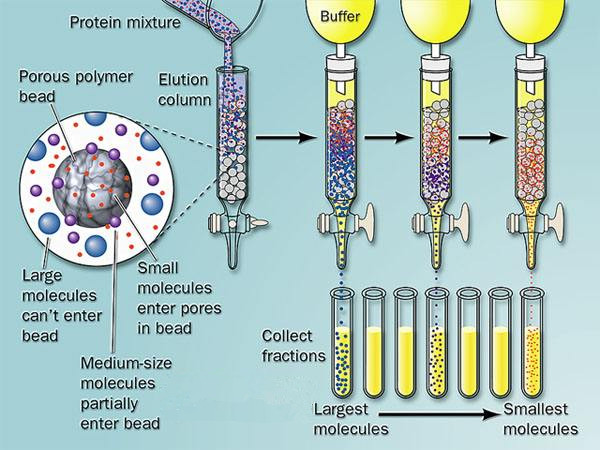 凝膠層析是利用分子篩作用對蛋白質(zhì)進行分離。凝膠是具有三維空間多孔網(wǎng)狀結(jié)構(gòu)的物質(zhì),經(jīng)過適當(dāng)?shù)娜芤浩胶夂螅b入層析柱。一種含有各種分子的樣品溶液緩慢地流經(jīng)凝膠層析柱時,大分子物質(zhì)不易進入凝膠顆粒的微孔,只能分布于顆粒之間,因此在洗脫時向下移動的速度較快,最先被洗脫。小分子物質(zhì)除了可在凝膠顆粒間隙中擴散外,還可以進入凝膠顆粒的微孔中,洗脫時向下移動的速度較慢,隨后被洗脫。因此,蛋白質(zhì)分子按分子大小被分離。