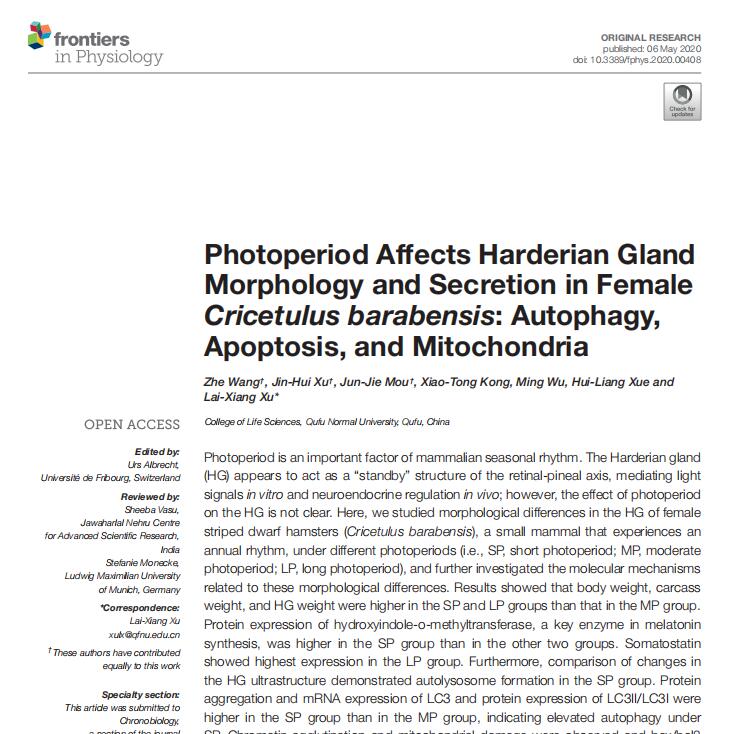 【文獻(xiàn)題目】 Photoperiod affects Harderian gland morphology and secretion in female Cricetulus barabensis: Autophagy,apoptosis, and mitochondria