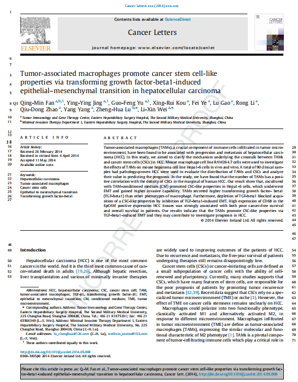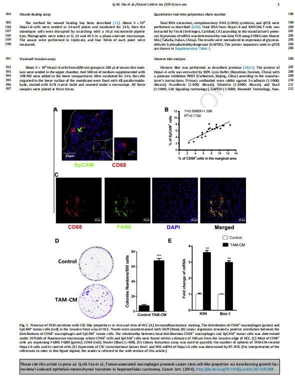 【文獻(xiàn)標(biāo)題】Tumor-associated macrophages promote cancer stem cell-like 4 properties via transforming growth factor-beta1-induced 5 epithelial–mesenchymal transition in hepatocellular carcinoma