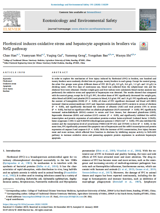 【文獻(xiàn)標(biāo)題】Florfenicol induces oxidative stress and hepatocyte apoptosis in broilers via Nrf2 pathway