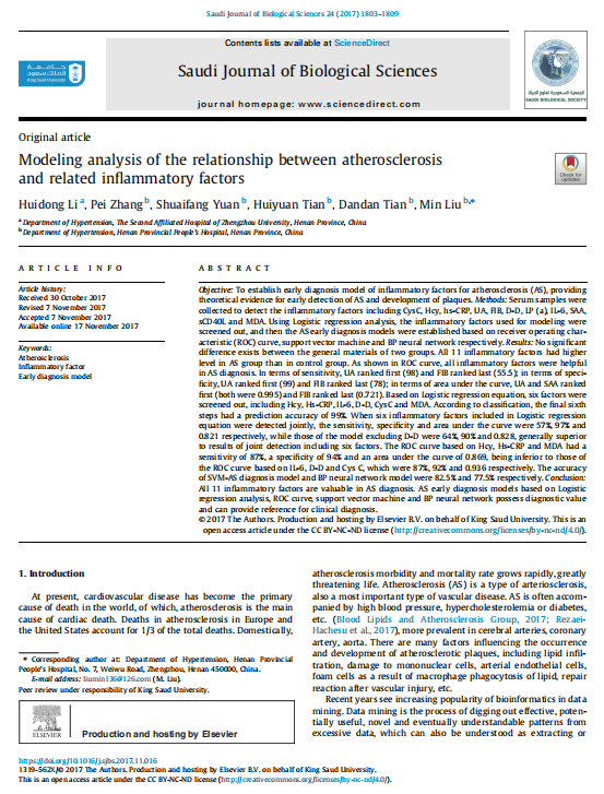 【文獻(xiàn)標(biāo)題】Modeling analysis of the relationship between atherosclerosis and related inflammatory factors