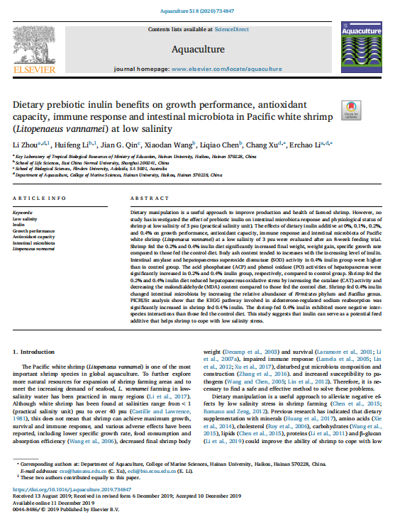 【文獻(xiàn)標(biāo)題】Dietary prebiotic inulin benefits on growth performance, antioxidant capacity, immune response and intestinal microbiota in Pacific white shrimp (Litopenaeus vannamei) at low salinity