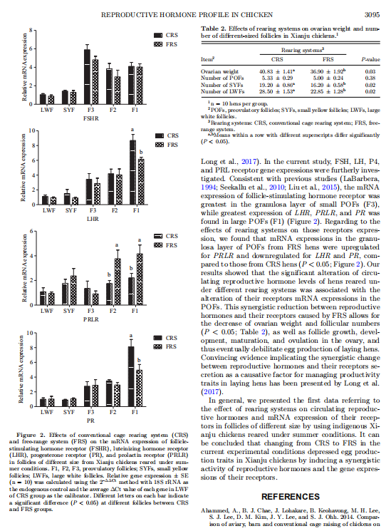 【文獻(xiàn)標(biāo)題】Effects of rearing systems on reproductive hormones secretion and their receptors gene expression in Xianju chickens under summer conditions