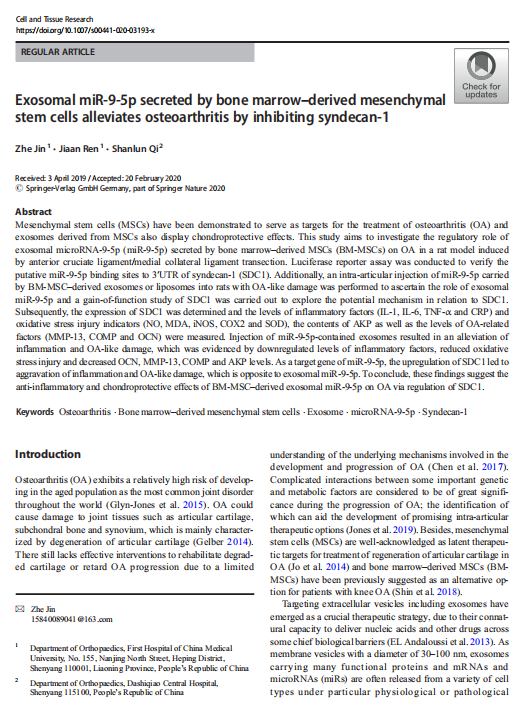 【文獻標題】Exosomal miR-9-5p secreted by bone marrow–derived mesenchymal stem cells alleviates osteoarthritis by inhibiting syndecan-1