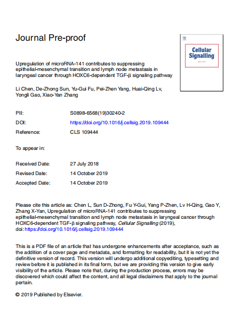 【文獻(xiàn)標(biāo)題】Upregulation of microRNA-141 contributes to suppressing epithelial-mesenchymal transition and lymph node metastasis in laryngeal cancer through HOXC6-dependent TGF-βsignaling pathway