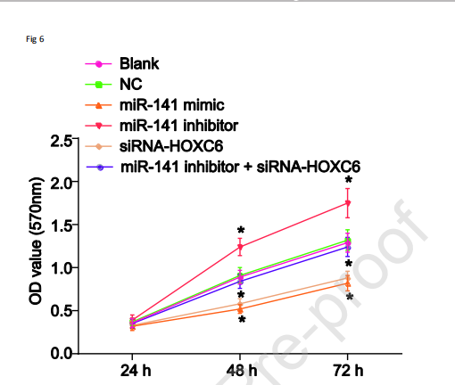 ImmunohistochemistryThe positive expression rates of HOXC6 in laryngeal cancer and adjacent normal tissues were detected by immunohistochemistry. Laryngeal cancer tissues and adjacent normal tissues were fixed in 4% paraformaldehyde for 24 h, dehydrated using 80%, 90% and 100% ethanol successively, cleared with n-butanol, placed in a paraffin box at 60°C and embedded in paraffin. After that, the tissues were cut into 5 μm-thick slices, deparaffinized with xylene after being heated at 60°C for 1 h. The slices were then dehydrated by gradient alcohol and soaked in 3% H2O2 for 10 min, followed by antigen retrieval. Next, the slices were boiled in 0.01 M citric acid buffer (pH = 6.0) at 95°C for 15 - 20 min, and incubated with 100 μL 5% bovine serum albumin (BSA) blocking solution at 37°C for 30 min, followed by incubating with 100 μL primary rabbit antibody to HOXC6 (1 : 50, PB0948, Wuhan Boster Biological Technology, Ltd., Wuhan, Hubei, China) overnight at 4°C. The slices were then incubated with biotin-labeled goat anti-rabbit (1 : 100, HY90046, Shanghai HengYuan Biological Technology Co., Ltd., Shanghai, China) at 37°C for 30 min and with streptavidin-peroxidase solution (Beijing Zhongshan Biological Technology Co., Ltd., Beijing, China) at 37°C for 30 min, and then developed by diaminobenzidine staining solution (Beijing Bioss Biological Technology Co., Ltd., Beijing, China) at room temperature. Subsequently, the slices were soaked in hematoxylin for 5 min, rinsed with 1% hydrochloric acid for 4 s and washed under tap water for 20 min. Brownish-yellow cells were confirmed as HOXC6 positive cells [23]. Five high-magnification visual fields were randomly selected from each slice with 100 cells per field. HOXC6 positive expression was defined by the percentage of positive cells: number of HOXC6 positive tumor cells/number of total tumor cells > 10% was counted as positive (+), < 10% was regarded as negative (-). Experiments were repeated 3 times independently.