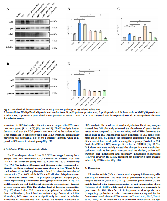 Dextran sulfate sodium (DSS, 36–50 kDa) was obtained from Meilun Biotech Co., Ltd. (Dalian, China). DHEA was obtained from Sigma (StLouis, MO, USA). 5-amino salicylic acid (5-ASA, a positive drug for UC therapy) was obtained from Yuanye Biotech Co., Ltd. (Shanghai,China). TRIZOL reagent kit, reverse transcriptase kit and SYBR Green Master Mix were obtainedfrom Vazyme Biotech Co., Ltd. (Nanjing,China). The MPO, MDA and SOD etection kits were obtained from Jiancheng Bioengineering Institute (Nanjing, China). The cytokine enzyme-linked immunosorbent assay (ELISA) kits were btained from Hengyuan Biotechnology Co., Ltd. (Shanghai, China). The Rabbit tip65, IkB-α, p38, phospho(p)-p65, p-IkB-α, p-p38 and iNOS were obtained from Sangon Biotechnology Co., Ltd. (Shanghai, China). The Rabbit anti-GAPDH, β-Tublin and HRP goat anti-rabbit IgG were obtained from Bioword Technology Co., Ltd. (Nanjing, China).