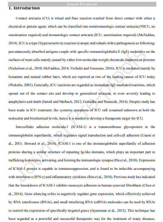 【文獻(xiàn)標(biāo)題】Silencing ICAM-1 reduces the adhesion of vascular endothelial cells in mice with immunologic contact urticaria