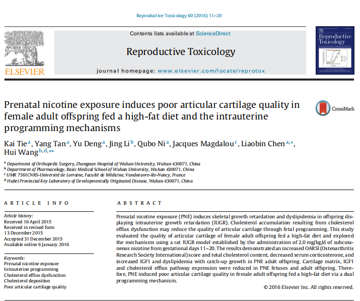【關(guān)鍵詞】Prenatal nicotine exposure,Intrauterine programming,Cholesterol efflux dysfunction,Cholesterol deposition,Poor articular cartilage quality