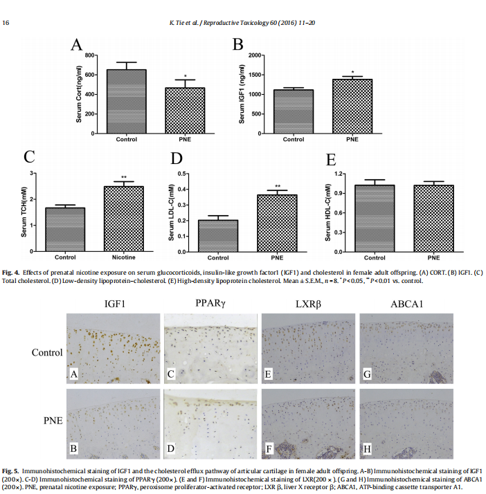 Nicotine (CAS. No. 54-11-5) was purchased from Sigma–Aldrich Co., Ltd.(St. Louis, MO, USA). Safranin O (CAS. No. 477-73-6) and fast green (CAS. No. 2353-45-9) were obtained from Hengyuan Biotech Co., Ltd. (Shanghai, China). Isoflurane was purchased from Baxter Healthcare Co. (Deerfield, IL, USA). Rat corticosterone (CORT)ELISA kits were obtained from R&D Systems, Inc. (Minneapolis,MN, USA). Rat IGF1 ELISA kits were purchased from RD Systems,Inc. (Minneapolis, MN, USA). Total cholesterol (TCH), low-density lipoproteincholesterol(LDL-C) andhigh-density lipoproteincholesterol (HDL-C) assay kits were purchased from Sangon Biotech Co.,Ltd. (Shanghai, China). Tissue TCH assay kits were purchased from Applygen Tech, Inc. (Beijing, China). Reverse transcription and quantitative PCR (Q-PCR) kits were purchased from Takara Biotechnology Co., Ltd. (Dalian, China). DAB staining kits were obtained from GeneTech Company, Ltd. (Shanghai, China). GeXP multiplex gene expression analysis kits were purchased from BeckmanCoulter Inc. (Fullerton, CA, USA). The oligonucleotide primers for rat Q-PCR genes (PAGE purification) and GeXP multiplex gene expression analysis (HPLC purification) were synthesized by Sangon Biotech Co., Ltd.(Shanghai, China). Polyclonal antibodies for the 1 chain of type II collagen gene (Col2A1), IGF1, PPAR, LXR and ABCA1were obtained from SantaCruz Biotechnology, Inc. (Santa Cruz, CA, USA). Other chemicals and agents were of analytical grade.