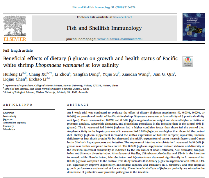 【文獻(xiàn)標(biāo)題】Beneficial effects of dietary β-glucan on growth and health status of Pacific white shrimp Litopenaeus vannamei at low salinity