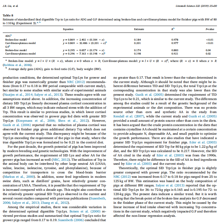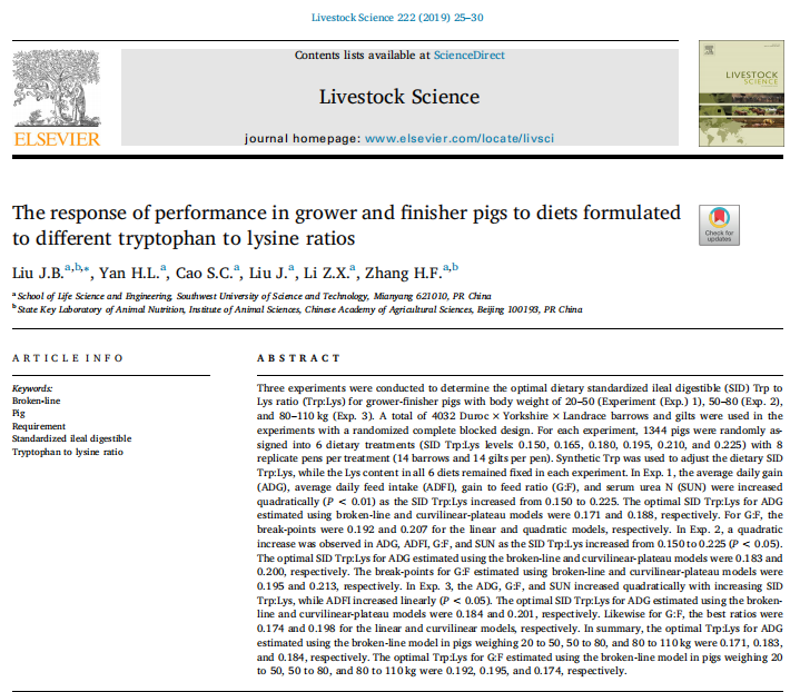 【關(guān)鍵詞】Broken-line,Pig,Requirement,Standardized ileal digestible,Tryptophan to lysine ratio