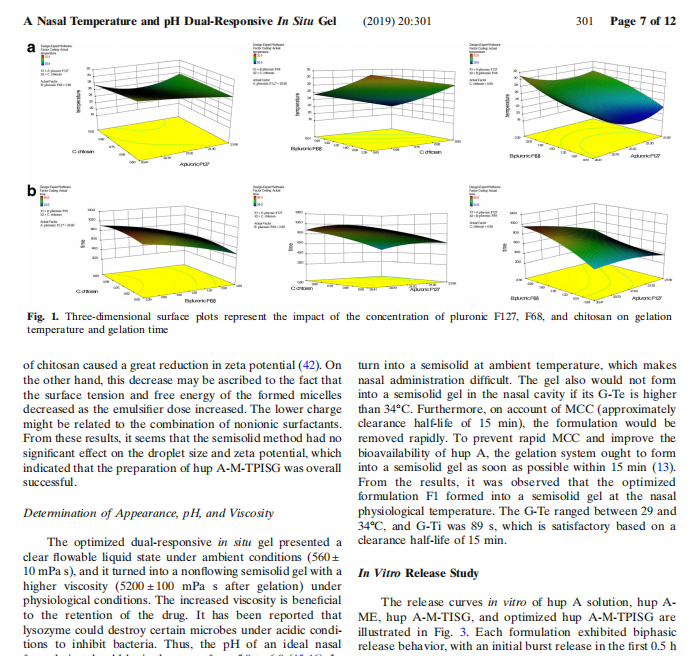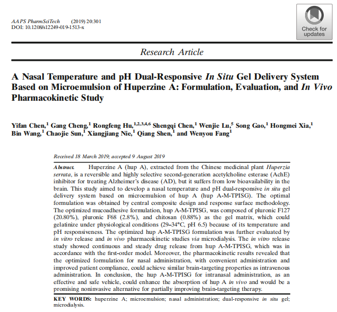 【文獻(xiàn)標(biāo)題】A Nasal Temperature and pH Dual-Responsive In Situ Gel Delivery System Based on Microemulsion of Huperzine A:ormulation, Evaluation, and In Vivo Pharmacokinetic Study