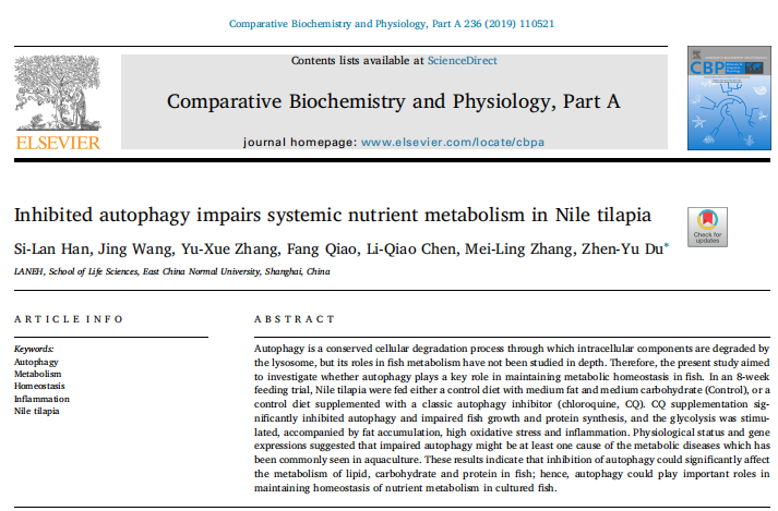 【文獻(xiàn)標(biāo)題】Inhibited autophagy impairs systemic nutrient metabolism in Nile tilapia
