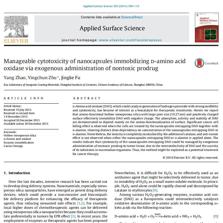 【文獻(xiàn)標(biāo)題】Manageable cytotoxicity of nanocapsules immobilizing d-amino acid oxidase via exogenous administration of nontoxic prodrug
