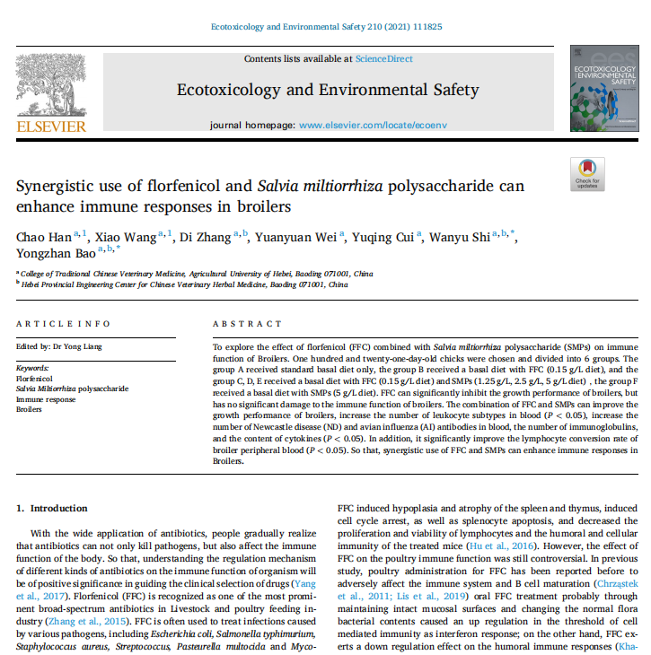 【文獻(xiàn)標(biāo)題】Synergistic use of florfenicol and Salvia miltiorrhiza polysaccharide can enhance immune responses in broilers