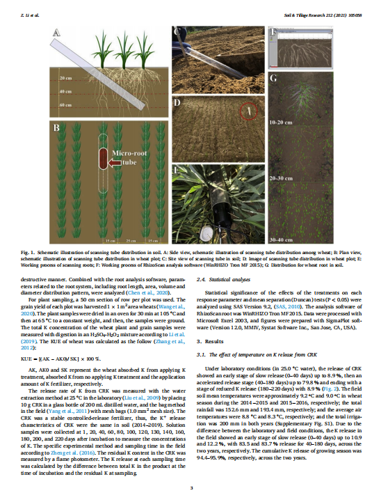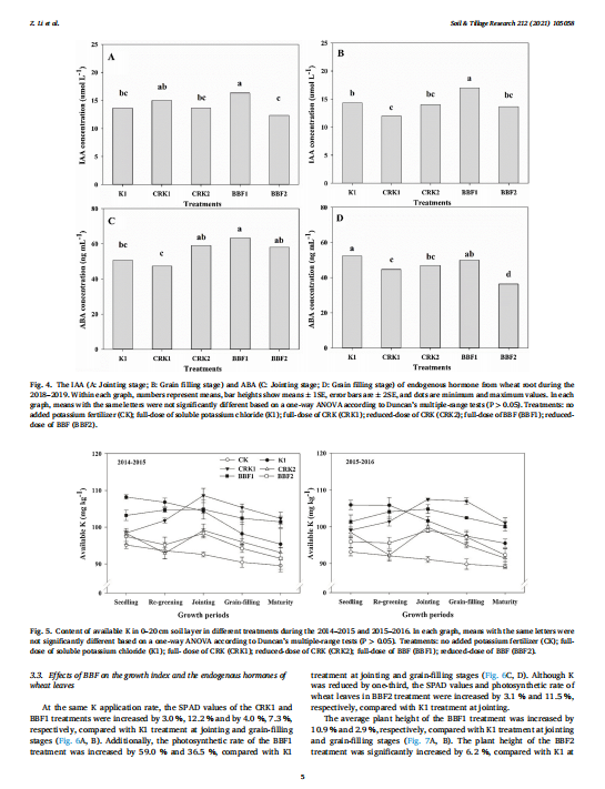 The yields were five consecutive years (2014–2019), so we explained the mechanism of increasing yield of controlled-release potassium chloride through physiological and biochemical indexes during growing seasons 2018? 2019. Samples from undisturbed surface soil (0–20 cm) were collected at seedling stage (31 days after fertilizing), re-greening stage (157 days after fertilizing), and after topdressing at jointing stage (188 days after fertilizing), grain-filling stage (210 days after fertilizing) and at maturity (245 days after fertilizing). At jointing and grain-filling stages, relative chlorophyll content (SPAD value) was determined by a chlorophyll meter (SPAD-502, Minolta, Japan) and conducted by Li et al. (2019). The photosynthesis of the ear leaf was measured by a Li-6400XT portable photosynthesis system (Licor Inc., Lincoln, USA). The leaf area index (LAI) by a canopy analyzer (LAI-2200, Beijing, China) was evaluated at five different points. Leaf and root samples were collected from the wheat during the jointing and grain-filling growth stages. Auxin (IAA) and abscisic acid (ABA) were estimated using the ELISA kit provided by Shanghai Hengyuan Biological 114 Technology Co. Ltd. (Shanghai, China). Soil samples of plowed horizons (0–20 cm) were collected from each plot, then air-dried in the laboratory, and any visible roots, organic residues, and stone fragments were removed manually, used by 2-mm, and 0.25-mm sieves, and further analyses. The available K of soil was extracted with 1.0 mol L? 1 of CH3COONH4 (7.0 pH) and analyzed with a flame photometer (MODEL410, Sherwood, England).