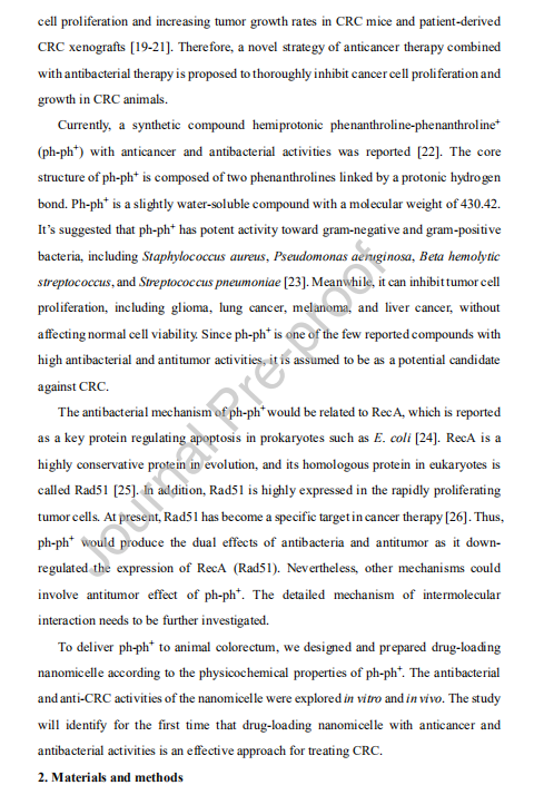 【文獻標(biāo)題】Treatment of colorectal cancer by anticancer and antibacterial effects of hemiprotonic phenanthroline-phenanthroline+ with nanomicelle delivery