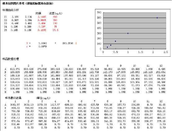 計算:以標(biāo)準物的濃度為橫坐標(biāo),OD值為縱坐標(biāo),在坐標(biāo)紙上繪出標(biāo)準曲線,根據(jù)樣品的OD值由標(biāo)準曲線查出相應(yīng)的濃度;再乘以稀釋倍數(shù);或用標(biāo)準物的濃度與OD值計算出標(biāo)準曲線的直線回歸方程式,將樣品的OD值代入方程式,計算出樣品濃度,再乘以稀釋倍數(shù),即為樣品的實際濃度