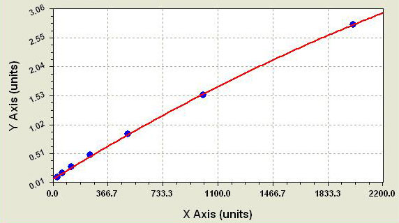 六.標(biāo)準曲線的繪制方法 可以采用各種繪圖軟件來繪制ELISA標(biāo)準曲線,我公司以“Curve Exert1.3”軟件為例,繪制的ELISA標(biāo)準曲線如下: